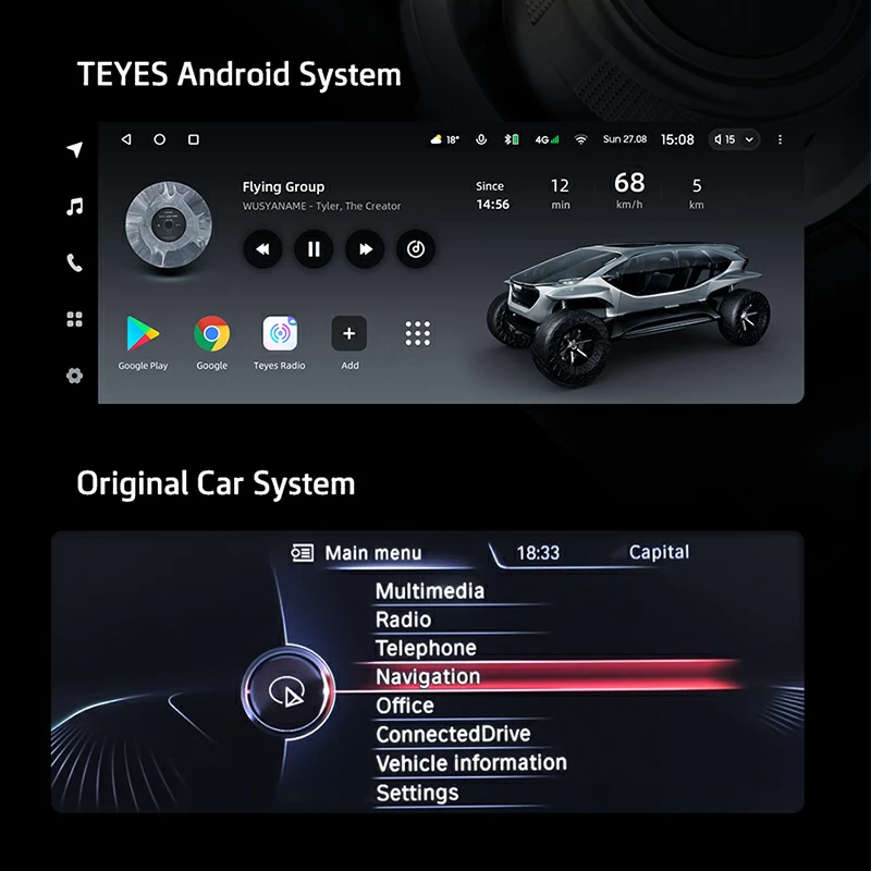 Apasa lung pe butonul MENIU pentru schimbarea între sistemul original al masinii si sistemul Android al navigatiei. Sistemul original al masinii ramâne neafectat si permite comutarea farâ întreruperi.