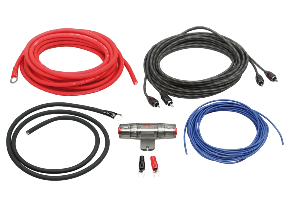 Kit de cabluri 8 AWG alcatuit din: cabluri de alimentare, soclu de siguranta + siguranta, cablu RCA si inele terminale, conceput pentru simplificarea instalarii sistemului audio auto.
